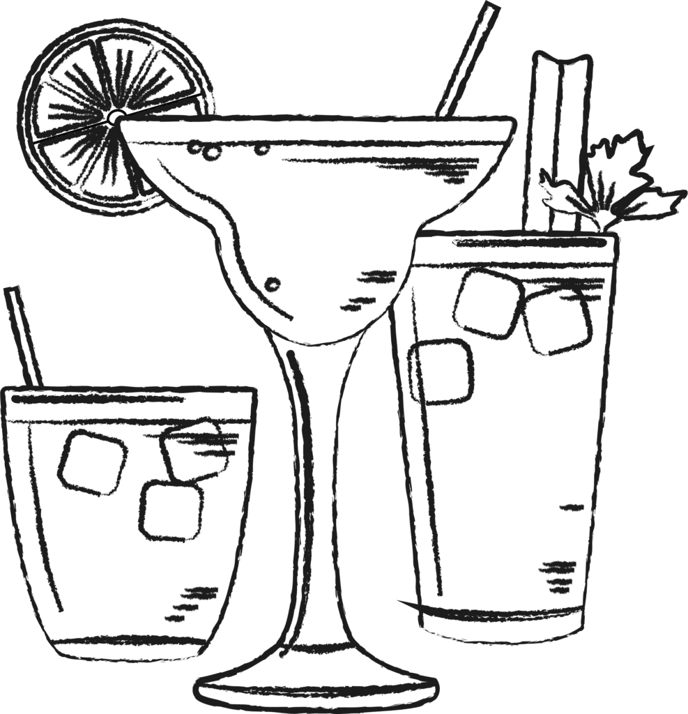 Cerveza, Americano, Aperol, Tequila, Caipirinha, Caipiroska, Fernet con coca, Gancia batido, Campari, Daiquiri, Gin tonic, Cuba libre, Destornillador y gaseosas.
